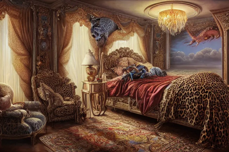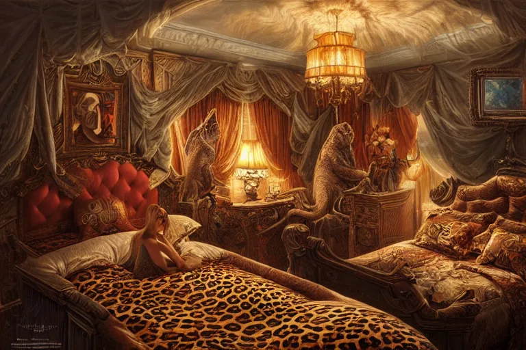 detailed leopard print bed in the vaporwave bedroom. highly detailed, digital painting, artstatio...Show more