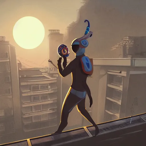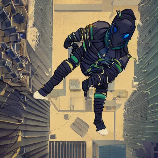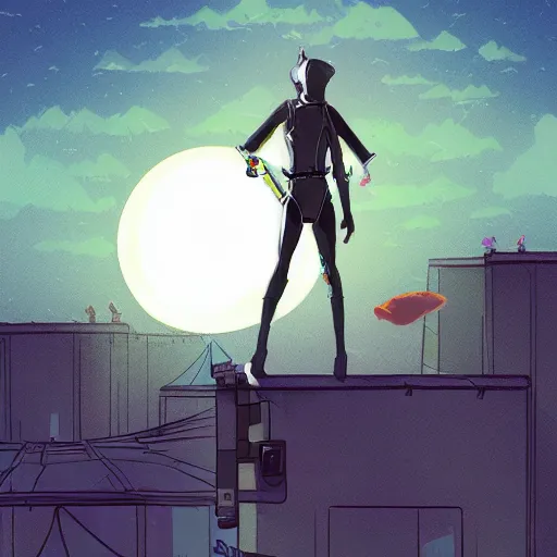 a lunarpunk ninja on the roof of the building watching the lunarpunk city, overhead view, digital art, trending on artstation, behance, deviantart,