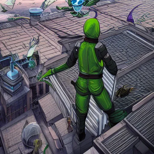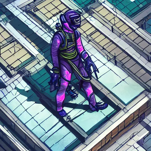 a lunarpunk ninja on the roof of a building overhead view, digital art, trending on artstation, behance, deviantart