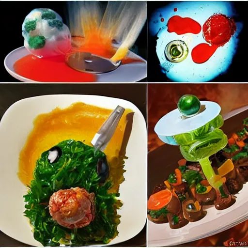 gourmet dinner in the style of weird science movie, molecular gastronomy, science textbook artwork