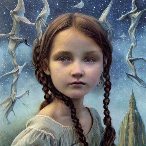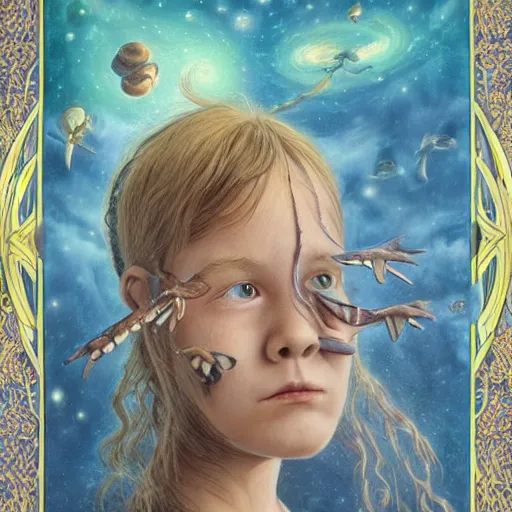 realistic detailed face portraits and fully body poses of children flying through the stars by em...Show more