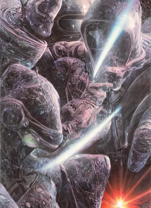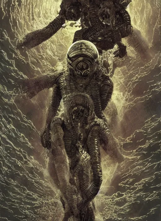 astronauts in dark and empty void underwater - complex and hyperdetailed technical suit. reflecti...Show more