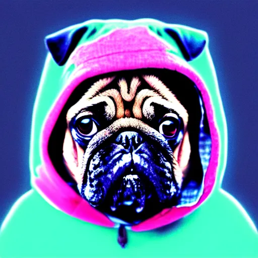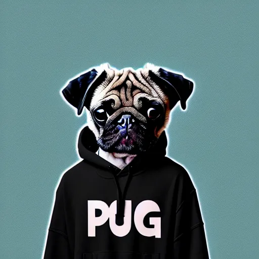 a sad pug wearing a hoodie, the word ( sad ) is written on the hoodie in upper case letters, typography, digital art, synthwave style, trending on artstation, matte painting