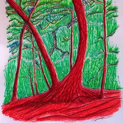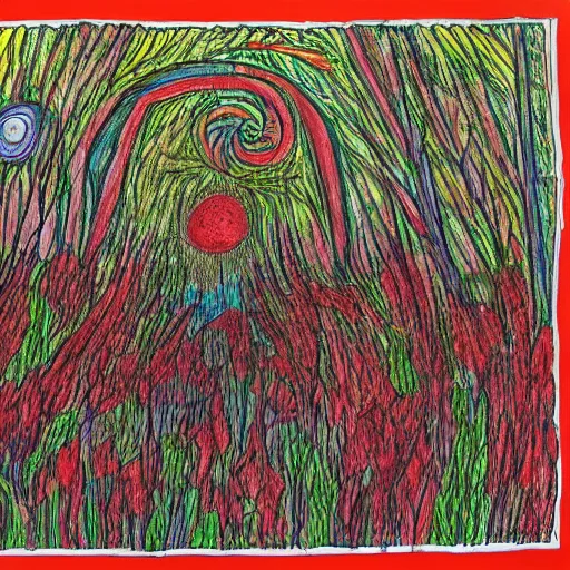 drawing of nature after humanity has been extinct outsider art style red ballpoint pen