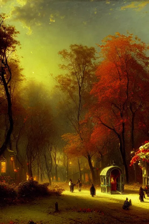 detailed painting of a victorian living capsule architecture, autumn dusk, leaves, flowers, dead trees. filigree ornaments, andreas achenbach