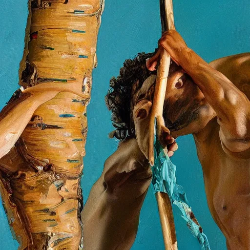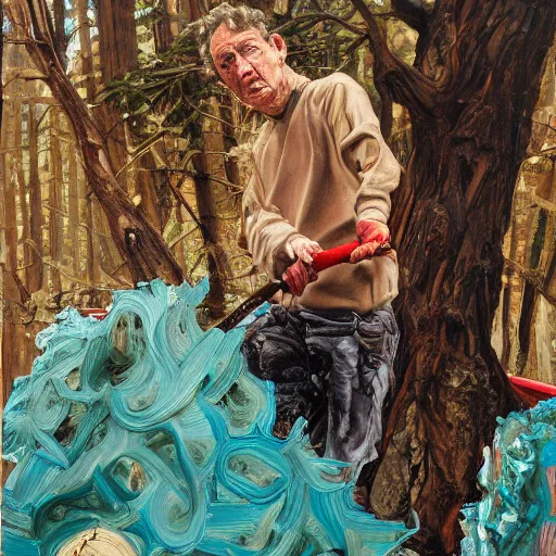 high quality high detail painting by lucian freud and jenny saville, hd, cutting a redwood tree, turquoise