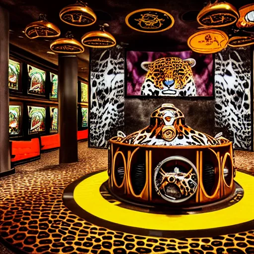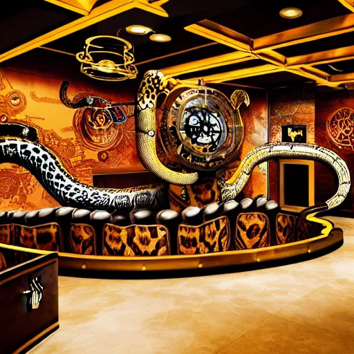 interior view of a clockwork steampunk snakeprint temple, rolex alien golf course liminal space,...Show more