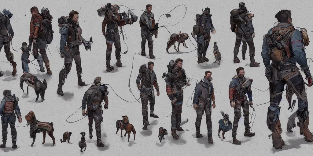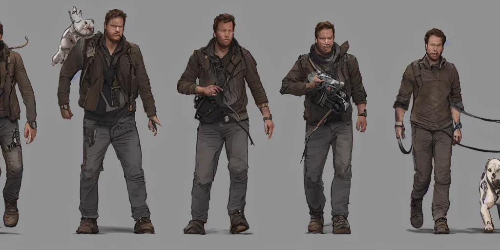 cartoonish chris pratt walking five dogs, character sheet, fine details, concept design, contrast...Show more