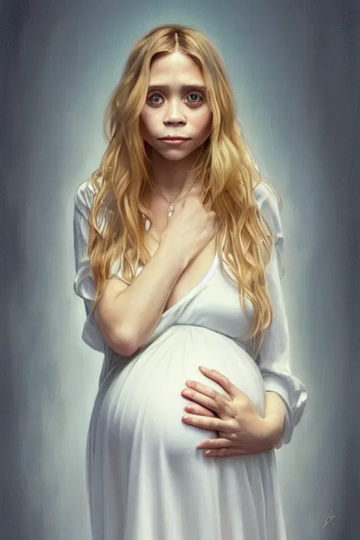 pregnant ashley olsen in a thin white dress, realistic portrait, symmetrical, highly detailed, di...Show more