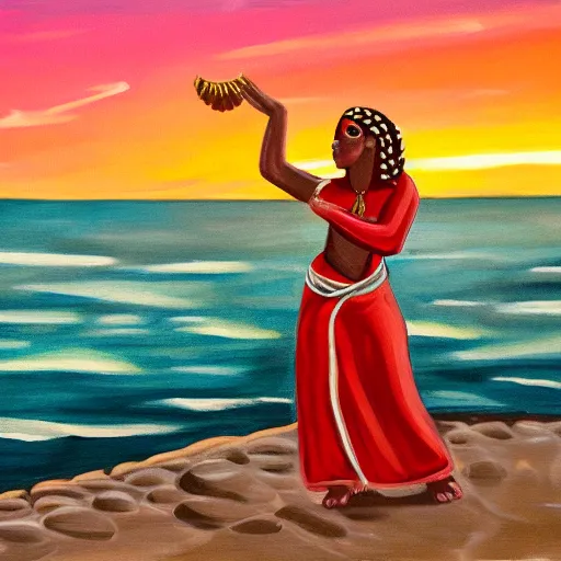 painting of 3 5 year old mediterranean skinned woman in ancient canaanite clothing dancing with a tambourine by the ocean, sunset, other women dancing behind, trending on art station