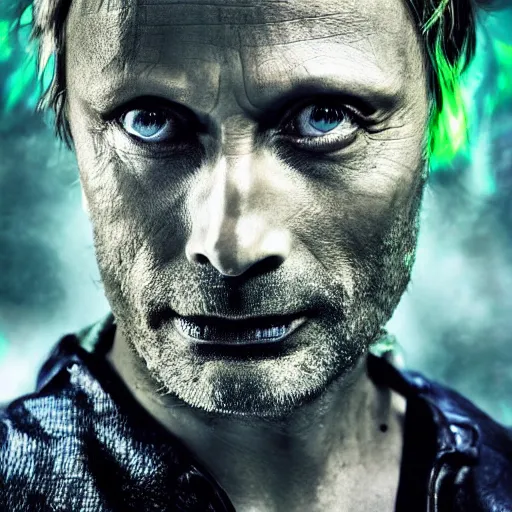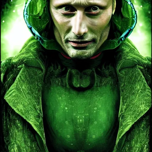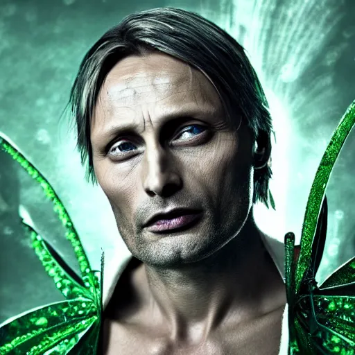 mads mikkelsen dressed as tinkerbell from disney's peter pan, green fairy dress, grim facial expression, high medieval fantasy, full color digital art, cinematic shot, portrait, wide shot.