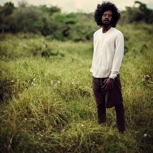 east african male, curly hair, muslim, in vast field, beautiful scenery, nature, vintage, dreamy, pastel, thoughtful, intricate details
