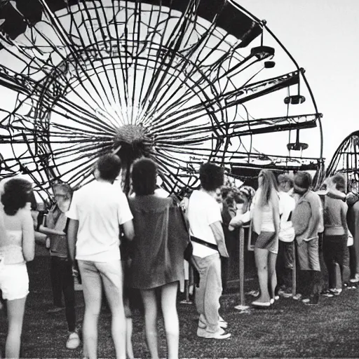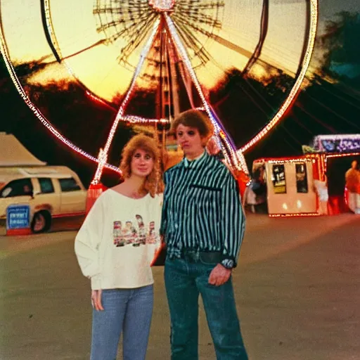 nostalgic 8 0 s nikon photo of a young couple waiting in line by a ferris wheel, sunset, small town carnival in the midwest