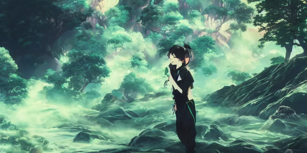 deep green anime eyes, prism highlights, depth of field, cinematic, concept art, art station, digital painting, elegant, epic, focus, octane render, v - ray, 8 k, c 4 d, art by katsushika hokusai