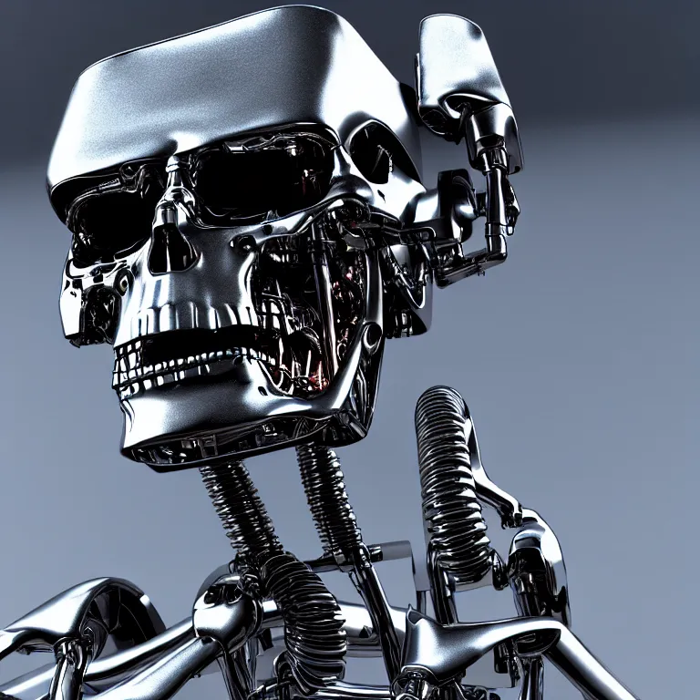 terminator endoskeleton with water behind it movie still, chrome, shiny, reflective, metallic, 3 d render, realistic, hdr, stan winston studios, dramatic lighting, water colors bright,