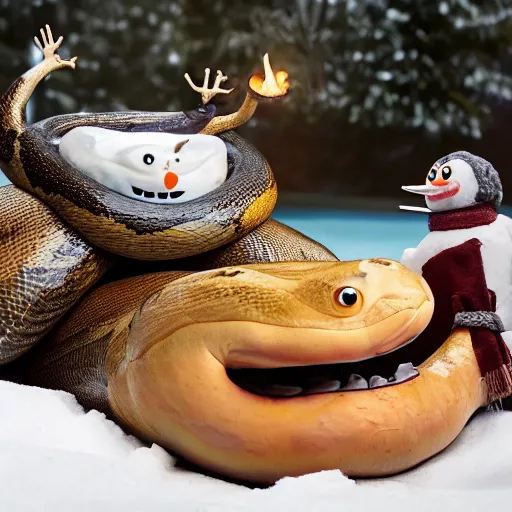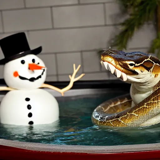 cinematic photo of a taxidermized fat snake held by a smiling taxidermized snowman in a hot tub