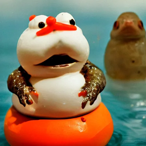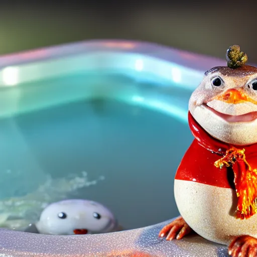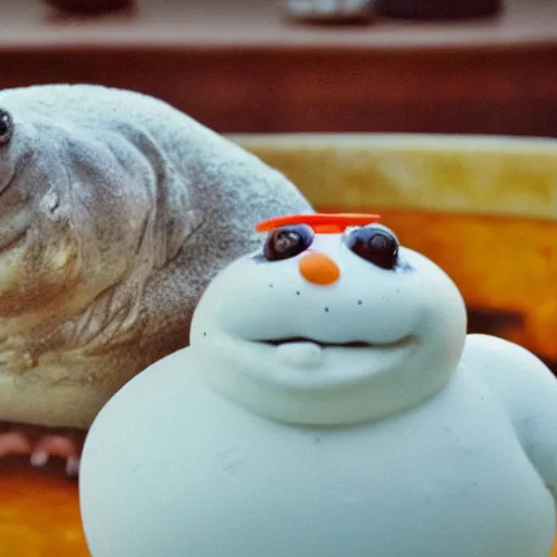cinematic photo of a taxidermized fat wet toad held by a smiling taxidermized snowman in a hot tub eating a skinned rat, vhs copy, film grain, motion blur, bokeh