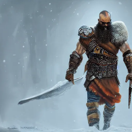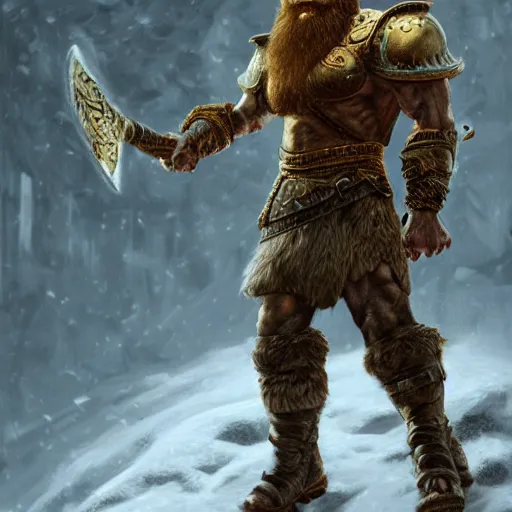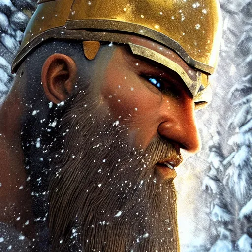 oil painting highly detailed concept art golden cyborg kratos beard viking in snow walking 8 k, unreal engine 5