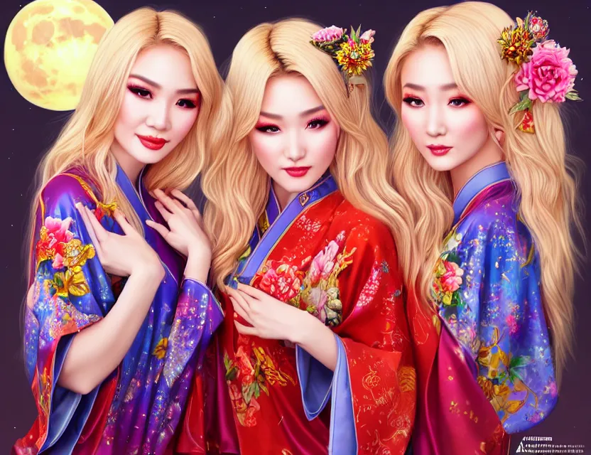 two beautiful alluring blonde uighur girls wear fantasy kimono in festival | | sunny night, full...Show more