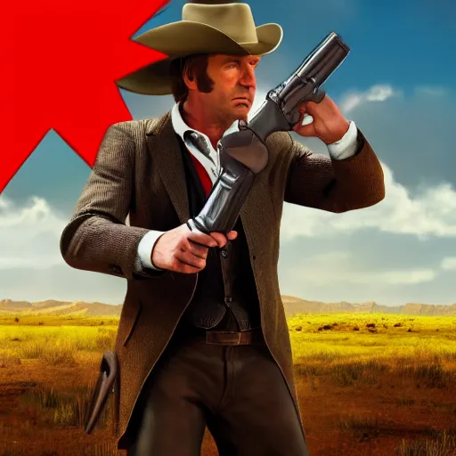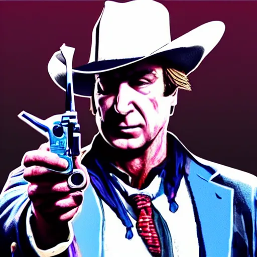 saul goodman as arthur morgan holding a revolver, stylized cinematic realistic dramatic cover
