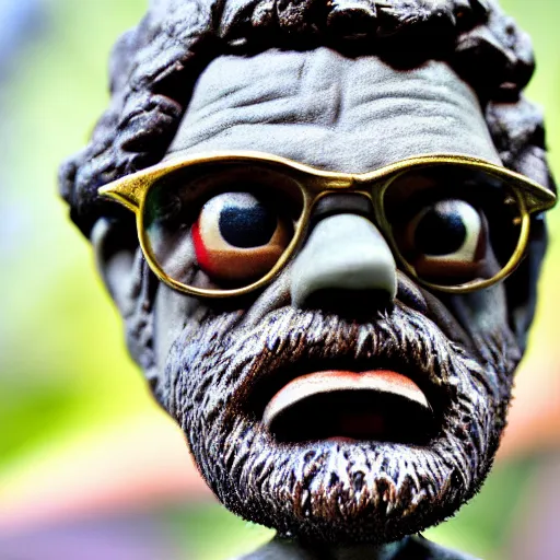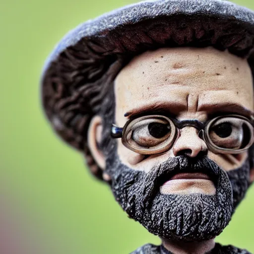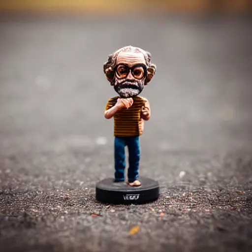 close up shot of a bobble head terence mckenna, depth of field, fstop 1. 3