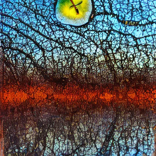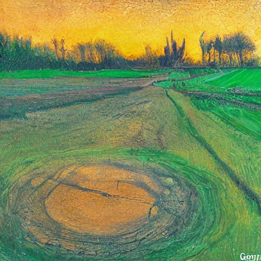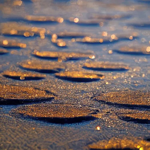 apple seed sits in a water spill on the soil ground, reflections of apple trees, sunset light, in the style of van goch