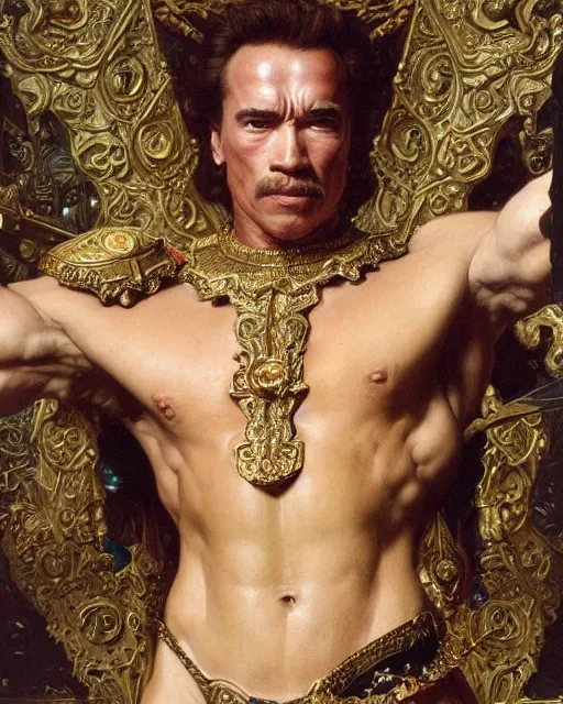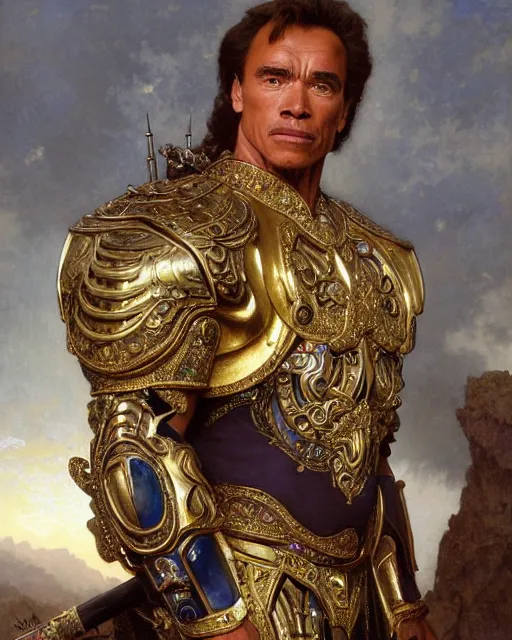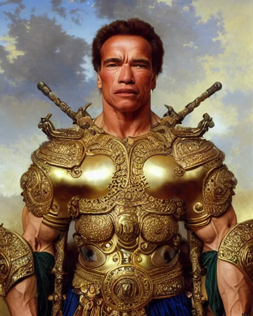 a arnold schwarzenegger, dressed in ornate, detailed, intricate iridescent opal armor, detailed oil painting by william adolphe bouguereau and donato giancola