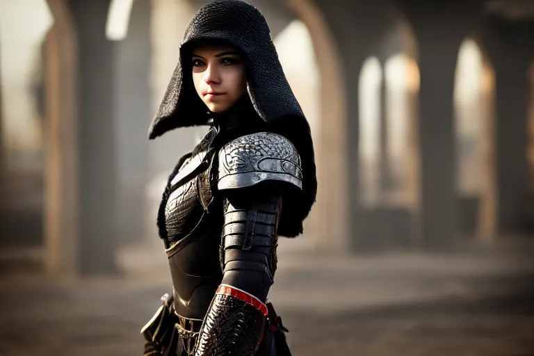 a beautiful female guard from neverwinter shyly posing on camera, symmetrical, cinematic, elegant, dawn light, real dlsr photography, sharp focus, 4 k, ultra hd, sense of awe