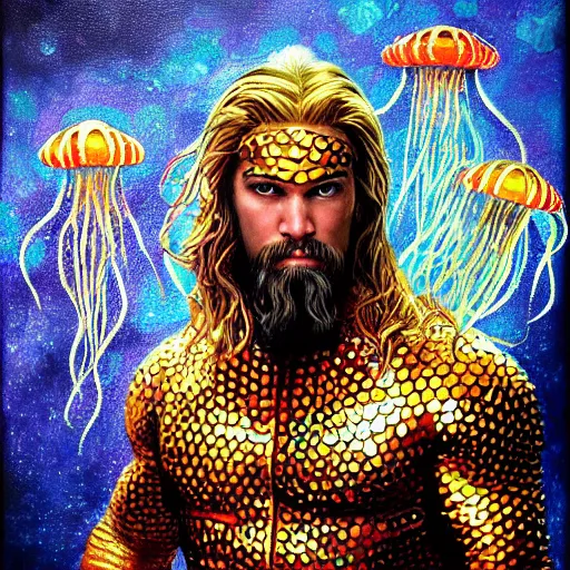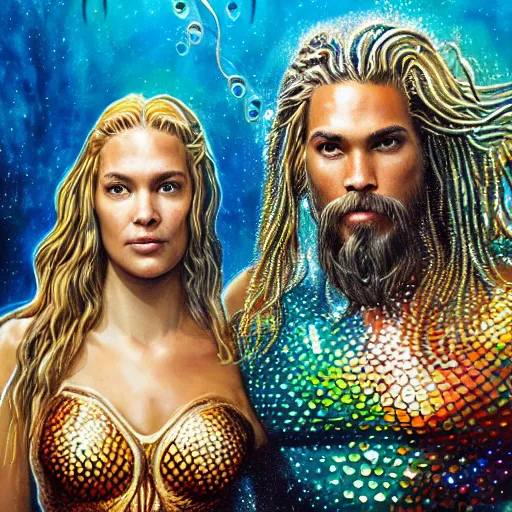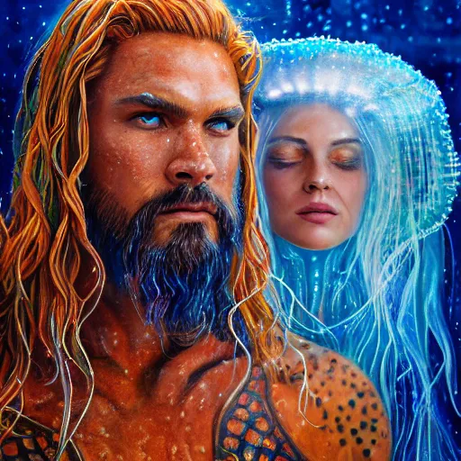 intricate five star portrait of aquaman as a jellyfish man and his wife as jellyfish woman, oil o...Show more
