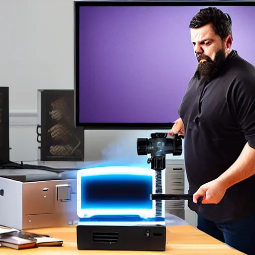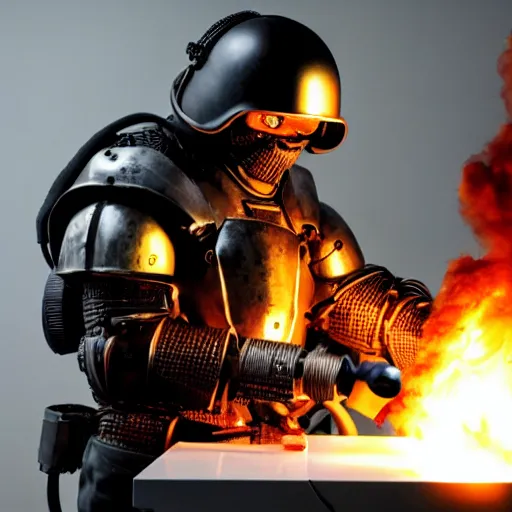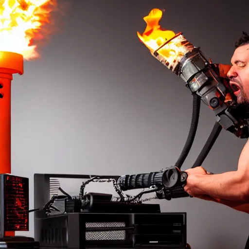angry man in juggernaut armor burning a desktop tower pc with a military flamethrower