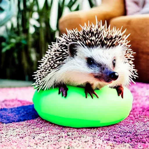 a hedgehog sitting on top of an inflatable unicorn bathing toy
