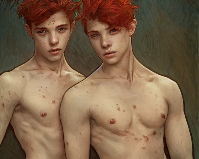 portrait of 1 9 - year - old male twins with red hair and freckles, two male, wearing shirts, hyp...Show more