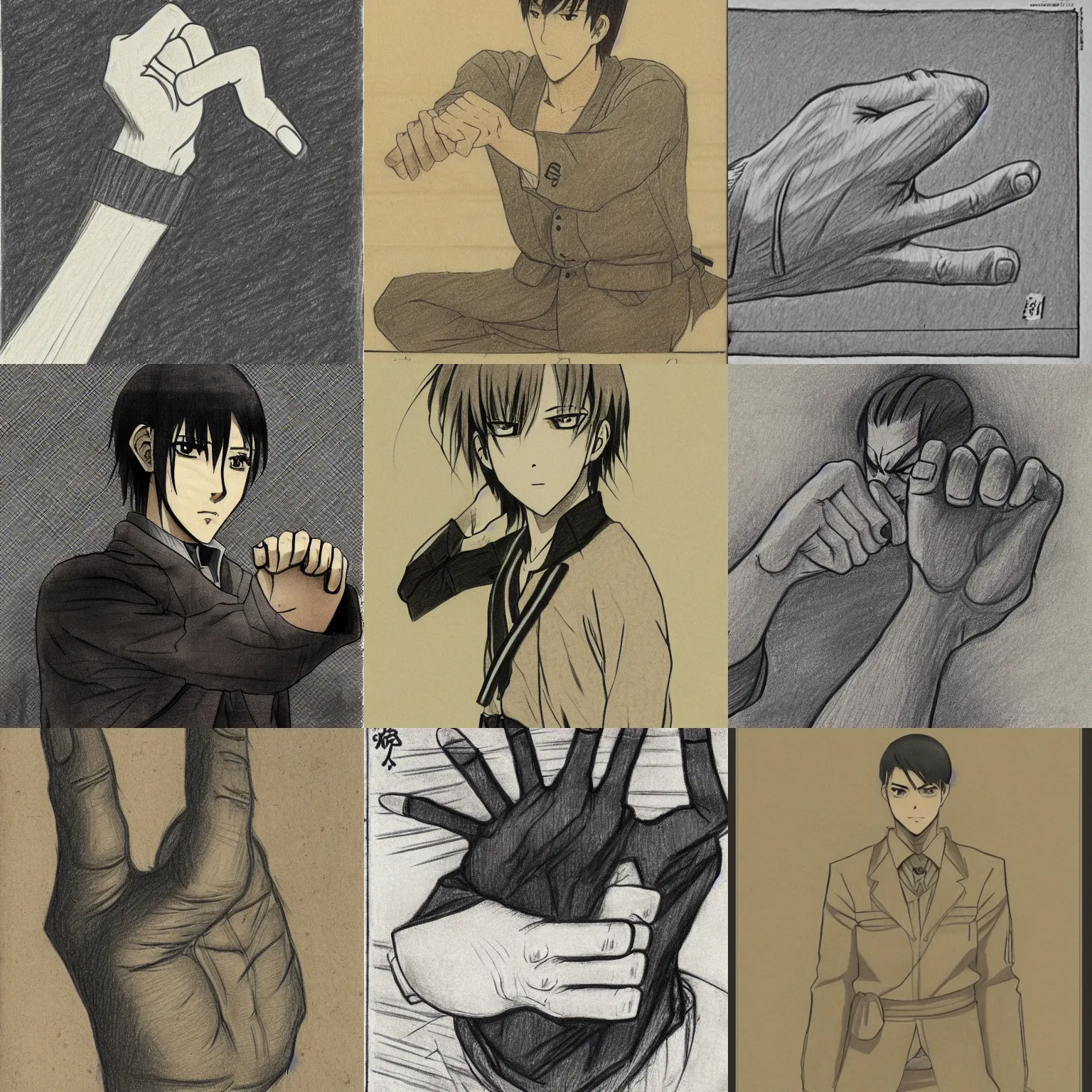 a drawing of a man with a hand closed in a fist, a manga drawing by shingei, featured on pixiv, shin hanga, official art, 2 d game art, concept art