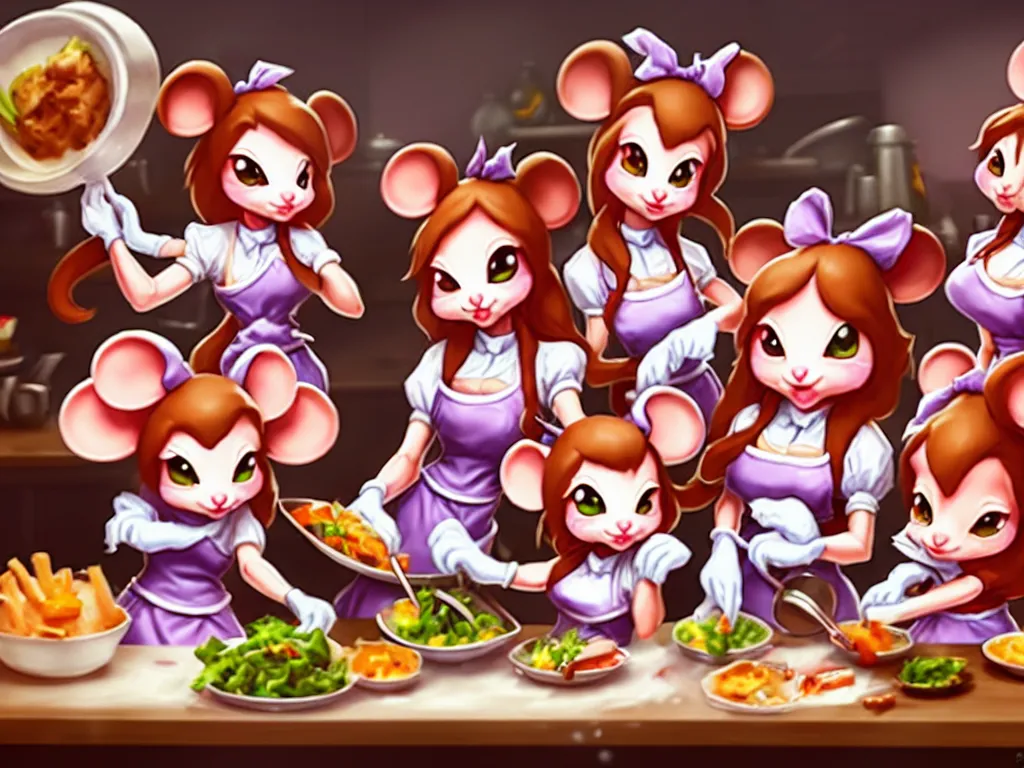 a team of cute anthropomorphic mouse girl maids preparing dinner in the kitchen. league of legends splash art