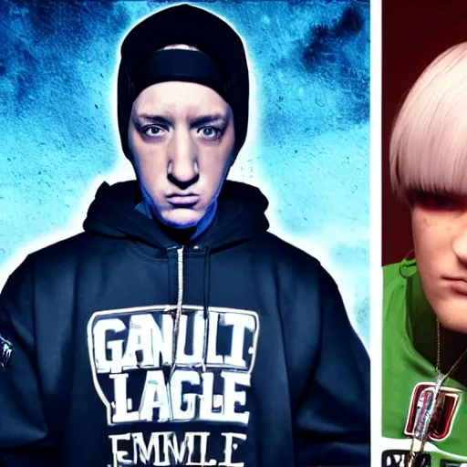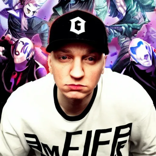 rapper eminem as a character in the game league of legends, with a background based on the game league of legends, detailed face
