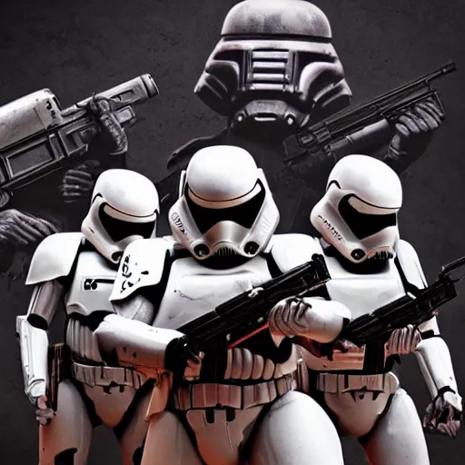 Prompt: Three enclave soldiers standing in the foreground, Half-Life Combine, Fallout Enclave Armor, Wolfenstein, Killzone, Deathtrooper, huge spaceship