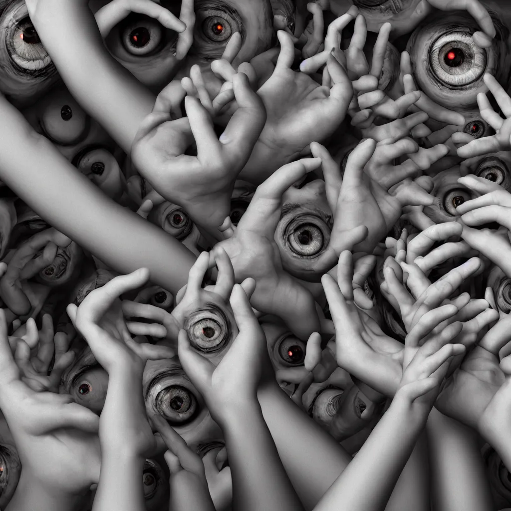 two hands holding dozens of human eyeballs, octane render, photo realistic, hyper realistic, 8 k resolution in the style of alvin schwartz