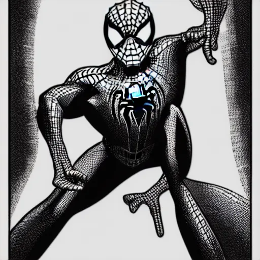 book illustration of spiderman pointing at spiderman pointing at spiderman. book illustration, monochromatic, white background, black and white image