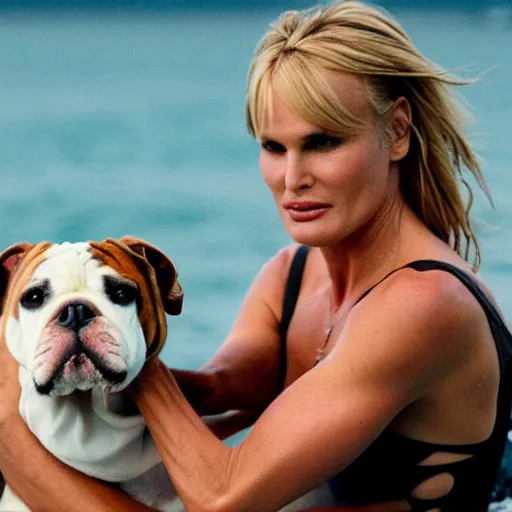 daryl hannah in splash with a staffordshire bulldog, professional lighting, cinematic, ultra detailed, perfect face, rules of thirds.
