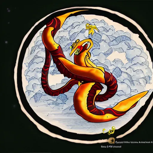 Prompt: a snake biting itself in the center of a tarot card with intricate details in the frames, colors: green, violet, blue, yellow, 4k, high quality render.