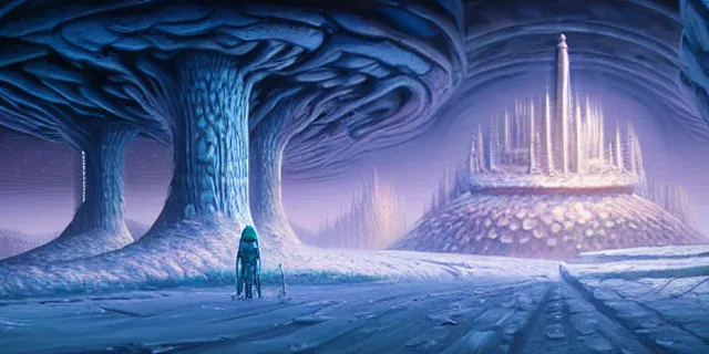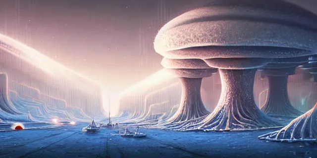 painting artic snow covered alien mushroomlabyrinth consuming futuristic mega city from blade in...Show more