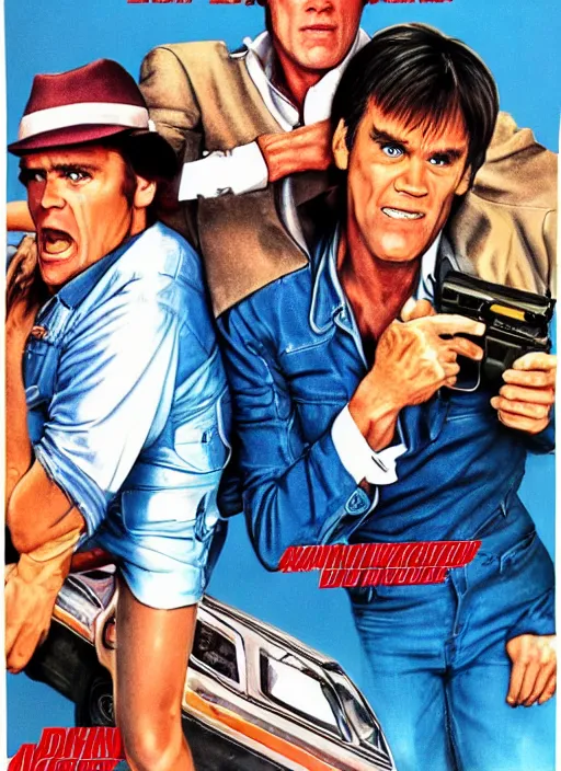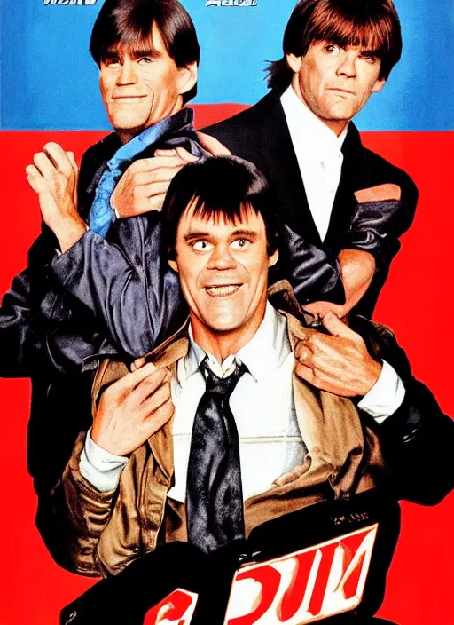 an 8 0's john alvin action movie poster of jim carrey starring in dumb and dumber.