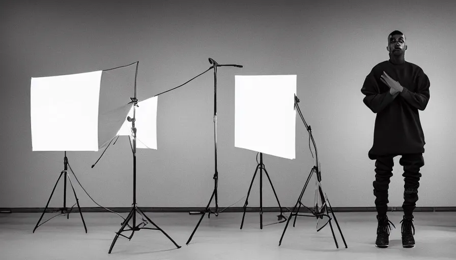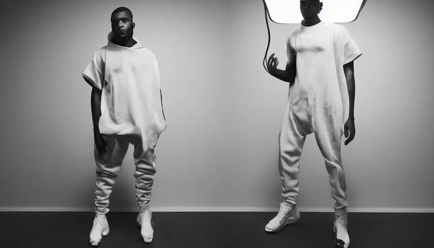 high quality studio photo shoot of a male model modelling yeezy inspired futuristic hoddle mockup, final product shot, studio lighting, all round angle. trending on futuristic fashion instagram.