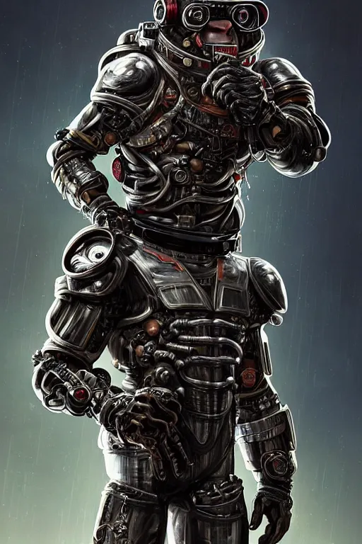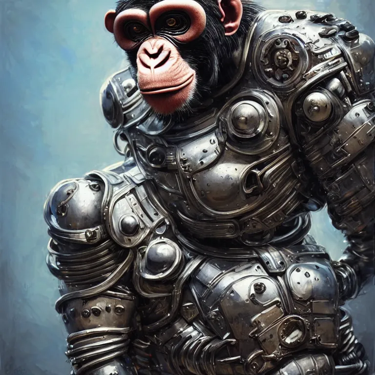 a portrait of a muscular anthropomorphic cyberpunk chimp in spacesuit armor with ensignia on ches...Show more