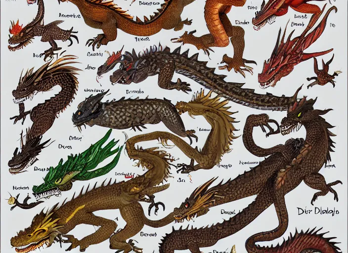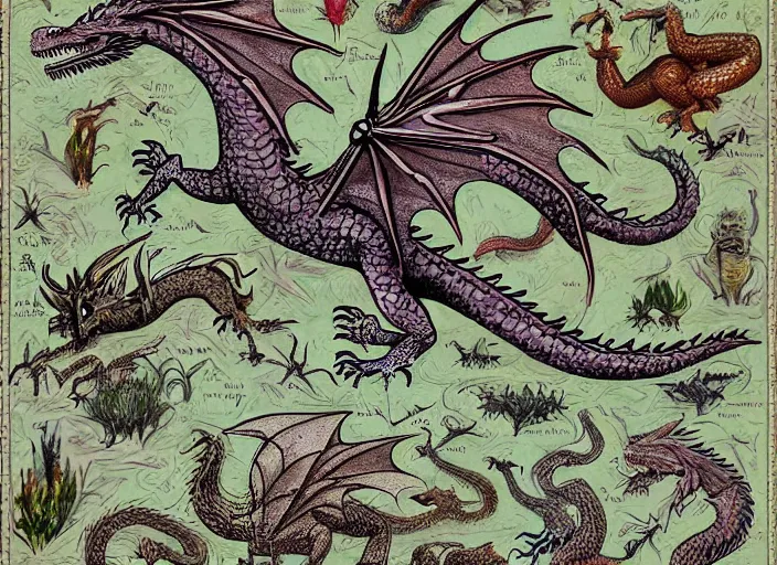 an illustrated field guide to dragons showing examples of males and females of each spicies, art...Show more