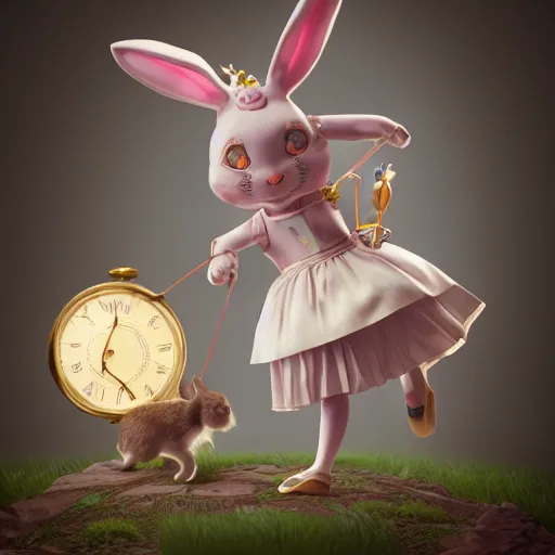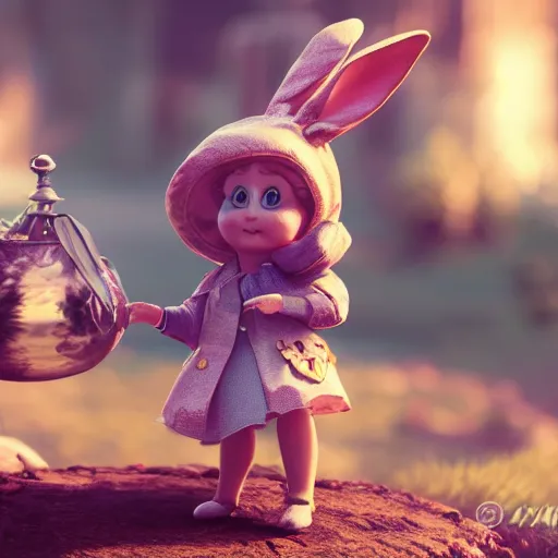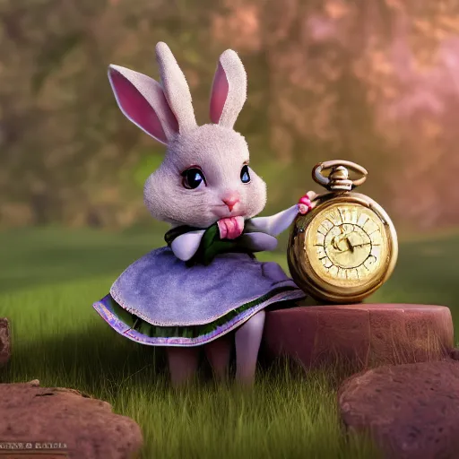 rabbit checking pocket watch doll figurine, alice in wonderland theme, octane render 8 k, disney inspired landscape, artstation, cinematic lighting, hd, ultra realistic