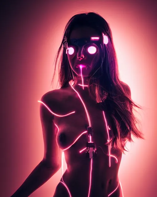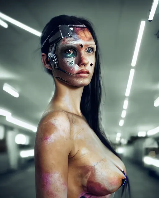 photo of sensual female as a solarpunk cyborg with fluorescent lamps over face, real human face with skin, ultra - realistic and detailed, long exposure, soft focus hdr 8 k