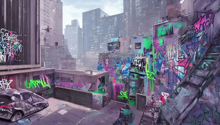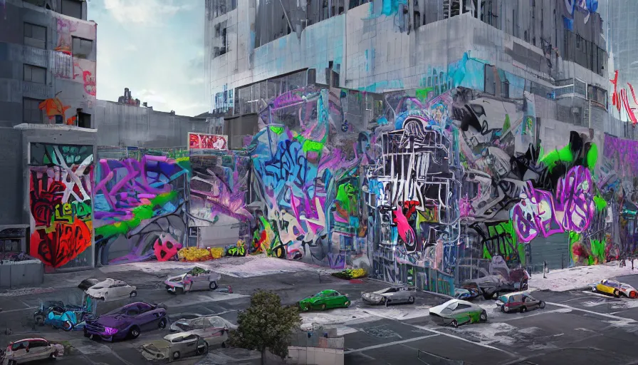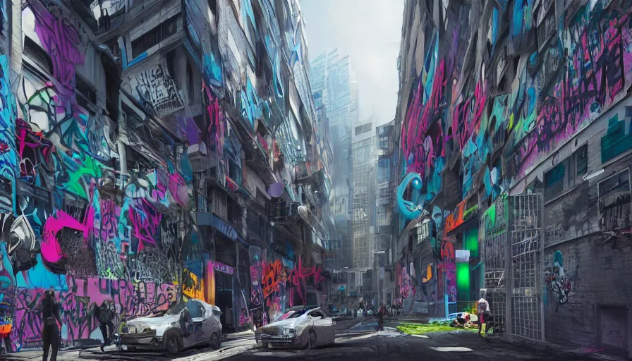 urbanpunk - graffiti artists creating a mural on a building in a high - tech, futuristic inner ci...Show more