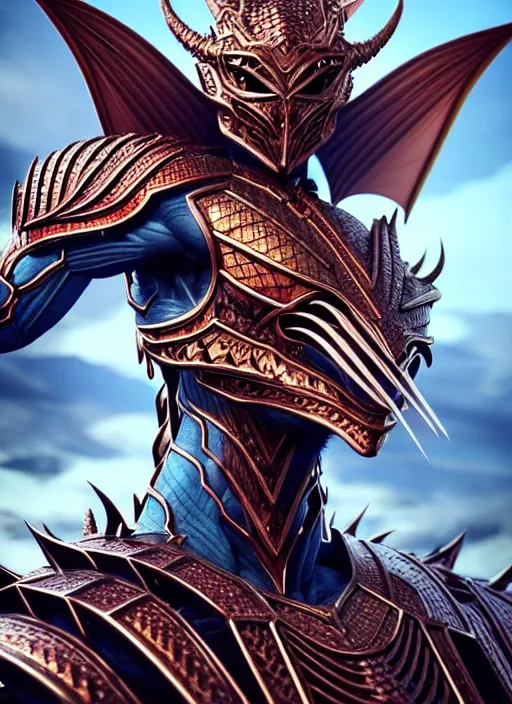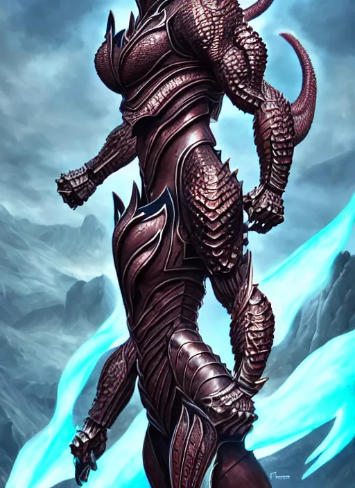 athletic and muscular humanoid dragon!!!! draconian!! intricate ornate iridescent scale armor!! c...Show more
