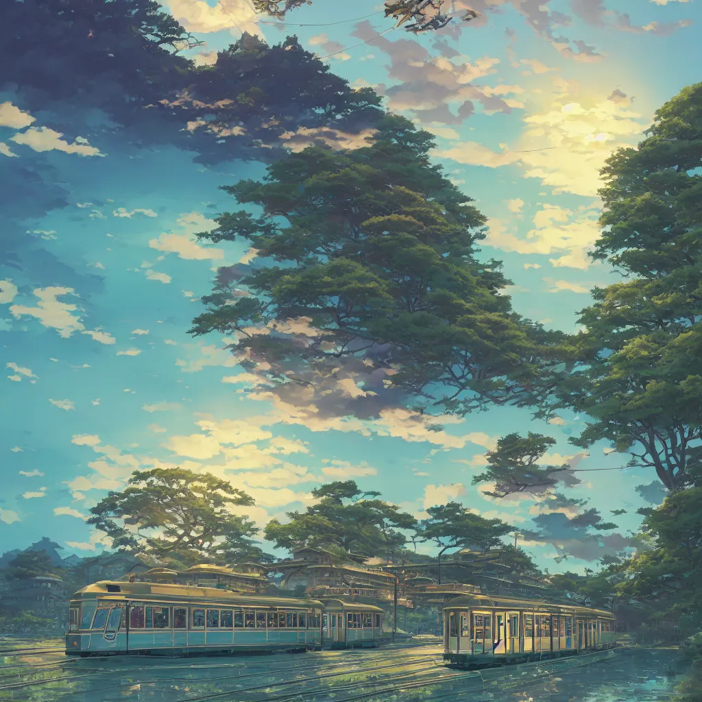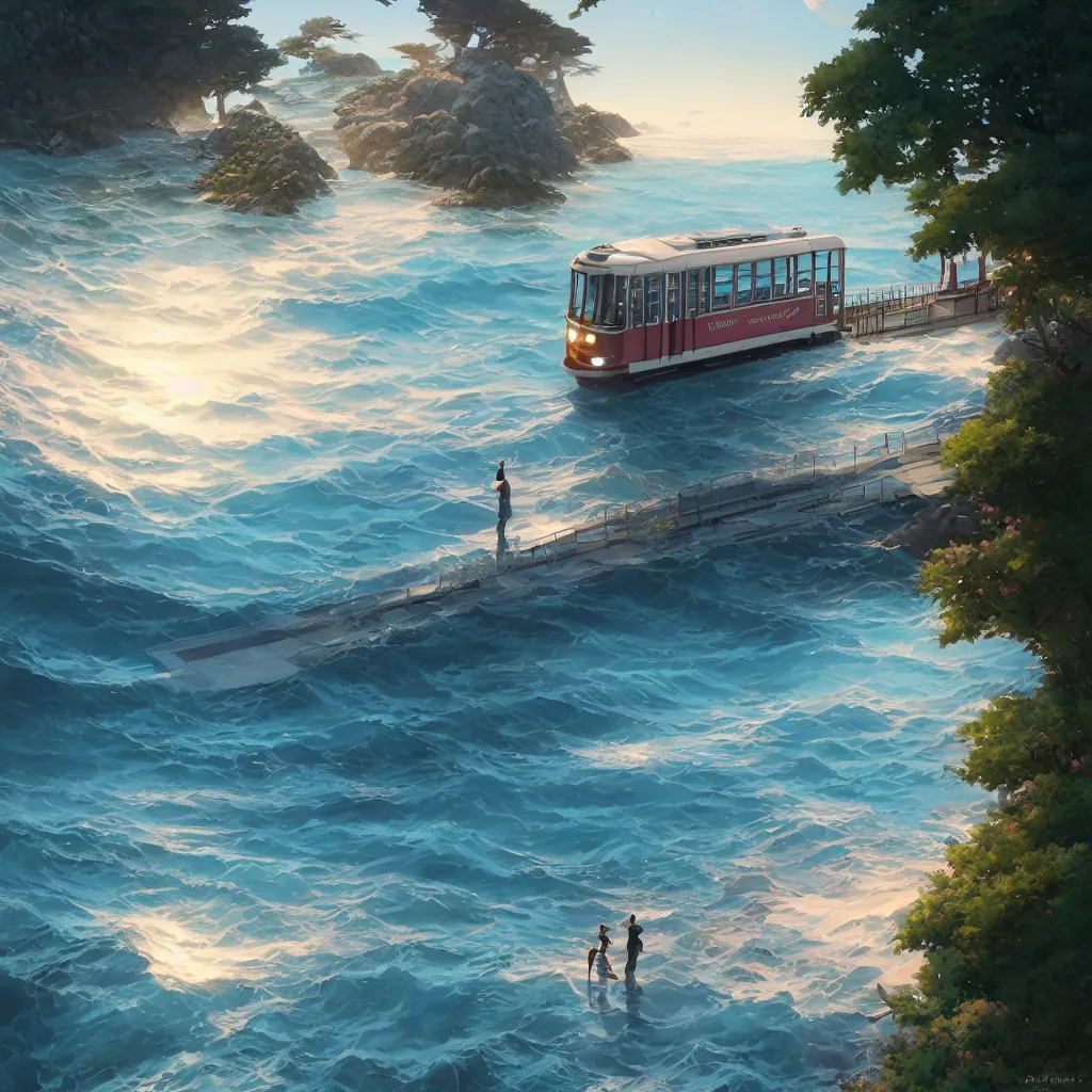 a streetcar is running on the dreamy sea, kamakura scenery, unreal engine, fantasy art by greg, l...Show more
